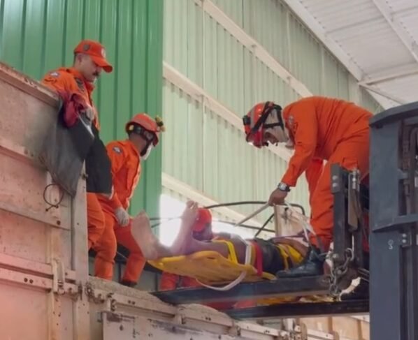 Ainda conforme os bombeiros, funcionários que acompanhavam a operação conseguiram cortar o saco para reduzir o peso sobre a vítima até a chegada do resgate. A equipe realizou a retirada do trabalhador do caminhão e iniciou o atendimento pré-hospitalar no local.