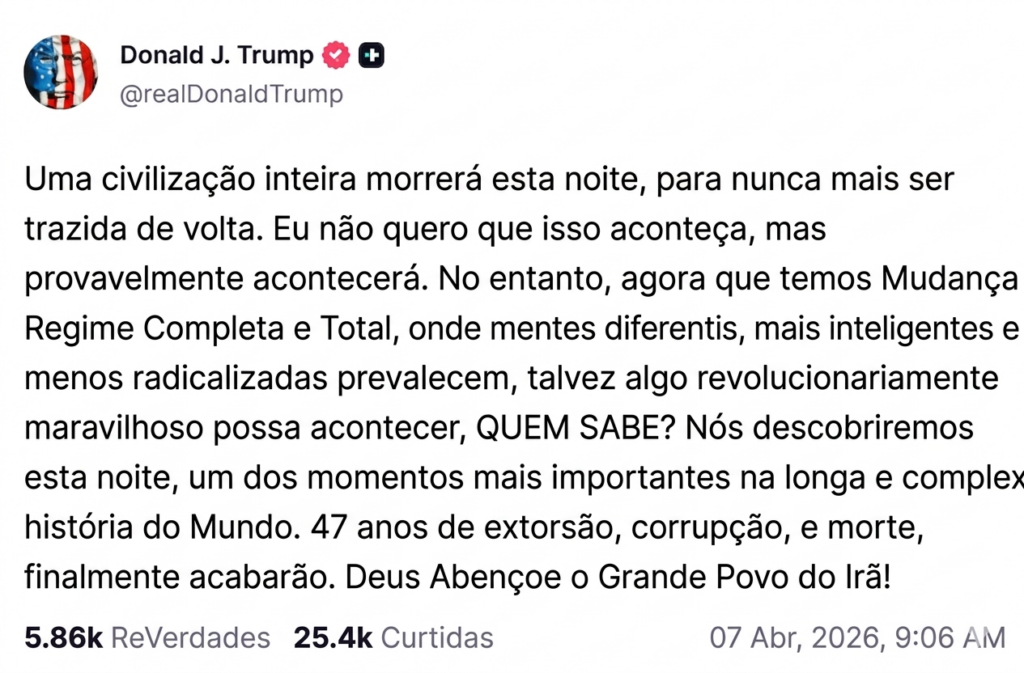 Em publicação na rede Truth Social, Trump afirmou que “uma civilização inteira morrerá esta noite, para nunca mais ser ressuscitada”, em referência ao país do Oriente Médio. Segundo ele, o desfecho deve ocorrer ainda nesta terça-feira, em um momento que classificou como decisivo para a história global.
