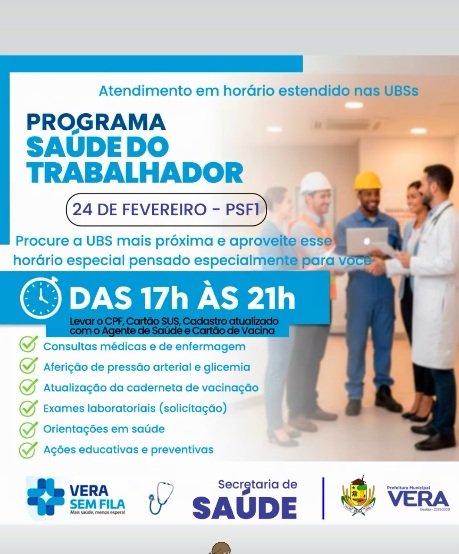 A Prefeitura de Vera, por meio da Secretaria Municipal de Saúde, realizará no próximo dia 24 de fevereiro mais uma importante ação voltada ao cuidado com a população trabalhadora do município. Trata-se do Programa Saúde do Trabalhador, que oferecerá atendimento em horário estendido nas Unidades Básicas de Saúde (UBSs), das 17h às 21h.